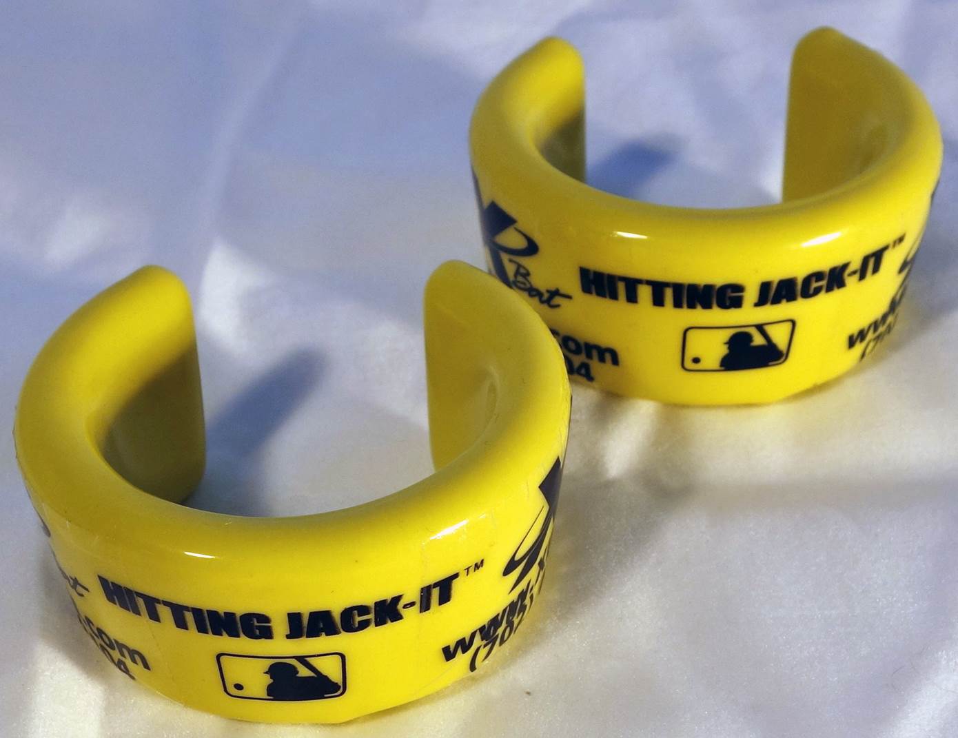 Slide the Hitting Jack-It™ onto the handle of the bat with the “wide end” facing up toward the barrel of the bat. Slide the Hitting Jack-It™ up the bat until snug. Turn the bat over and tap the bat on the ground firmly securing the Hitting Jack-It™ in place. For overall safety the open slot of the Hitting Jack-It™ should always face the catcher and the closed side with the logo should always face the pitcher.